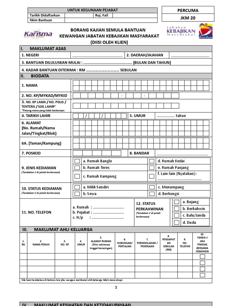 Borang permohonan bantuan jabatan kebajikan masyarakat kategori permohonan baru 1. Anda perlu minta kepada kaunter jkm untuk dapatkan bora permohonan jkm 18 borang permohonan bantuan. Untuk keterangan lanjut mengenai bantuan yang telah dipohon sila hubungi pejabat kebajikan masyarakat daerah bahagian jajahan di mana permohonan bantuan ini dibuat atau hubungi ibu pejabat jkm melalui talian 03 8000 8000. Perujuk sekiranya diisi oleh perujuk.