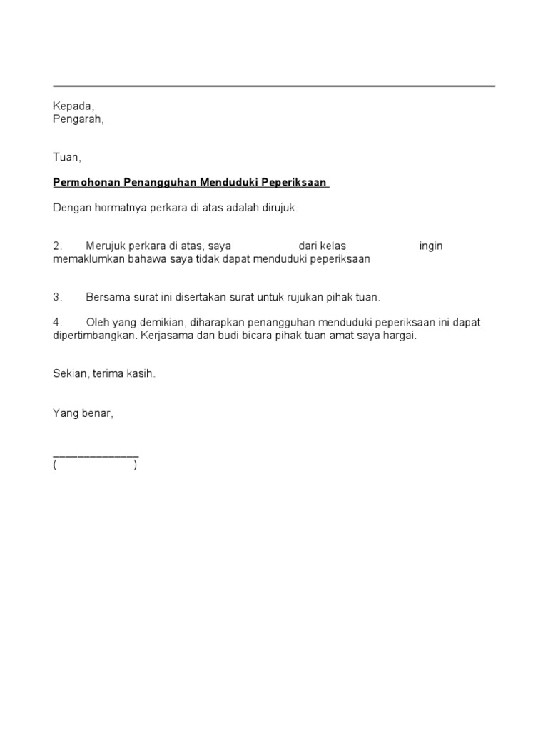 Contoh surat rasmi penangguhan peperiksaan. Kenyataan sebab tidak menghadiri peperiksaan dan rayuan mengambil peperiksaan kembali merujuk perkara di atas saya pelajar ingin memberi penjelasan tentang ketidak hadiran saya dalam peperiksaan kertas xxxxxxxx pada 9 00 pagi xxxxxxx di uiam adalah disebabkan kesilapan dan juga kecuaian saya melihat jadual peperiksaan dengan sewajarnya. Surat penangguhan lapor diri. Tekan butang untuk muat turun. Contoh surat kiriman rasmi.