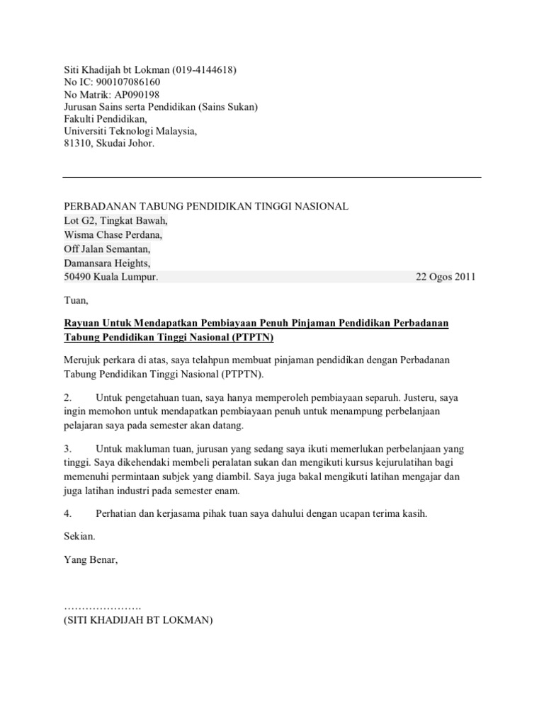 Contoh Surat Rayuan Ptptn Permohonan Pinjaman Cute766