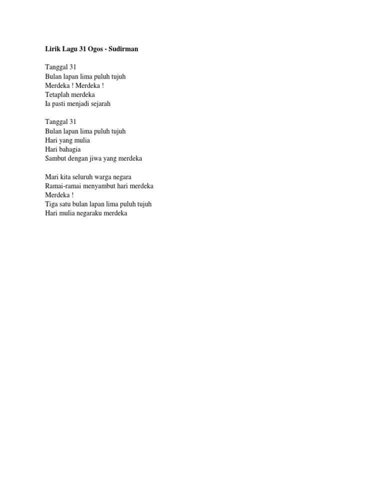 Lirik Lagu Tanggal 31 Docx Lirik Lagu Tanggal 31 Tanggal 31 Bulan Lapan Lima Puluh Tujuh Merdeka Merdeka Tetaplah Merdeka Ia Pasti Menjadi Sejarah Course Hero