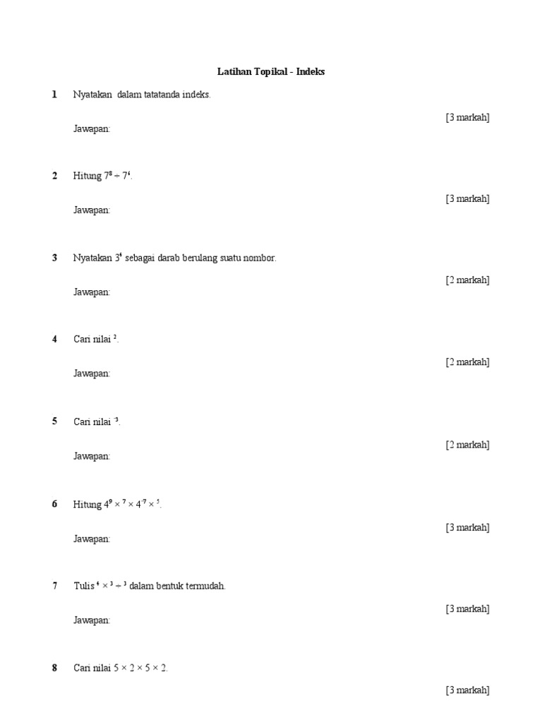 Soalan Latihan Indeks Tingkatan 3 Selangor V