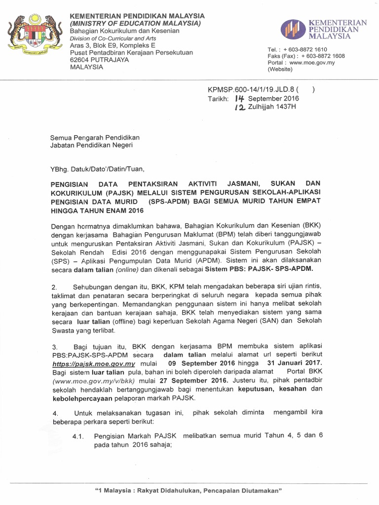 Surat Siaran Pengisian Data Pajsk Sekolah Rendah Tahun 2016