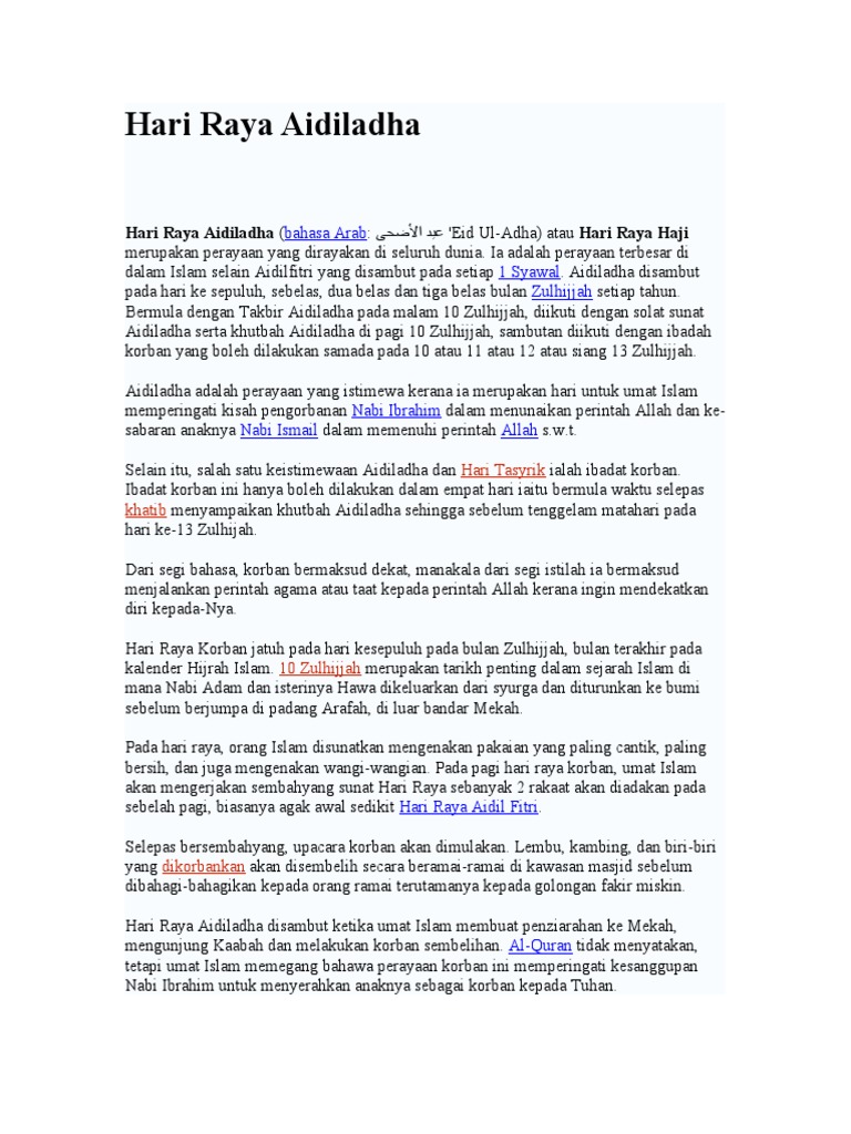 Sejarah maksud hari raya aidiladha. Sesungguhnya allah mengganti kedua hari raya itu dengan hari raya yang lebih baik yakni aidilfitri dan aidiladha hadis riwayat daud dan nasai hari raya aidilfitri pertama kalinya dirayakan umat islam selepas perang badar pada 17 ramadan tahun ke 2 hijrah ensiklopedia islam. عيد الأضحى eid ul adha atau hari raya haji merupakan perayaan yang dirayakan oleh umat islam di seluruh dunia. Aidiladha disambut pada hari ke sepuluh sebelas dua belas dan tiga belas bulan zulhijjah setiap tahun. Hari raya aidiladha bahasa arab.