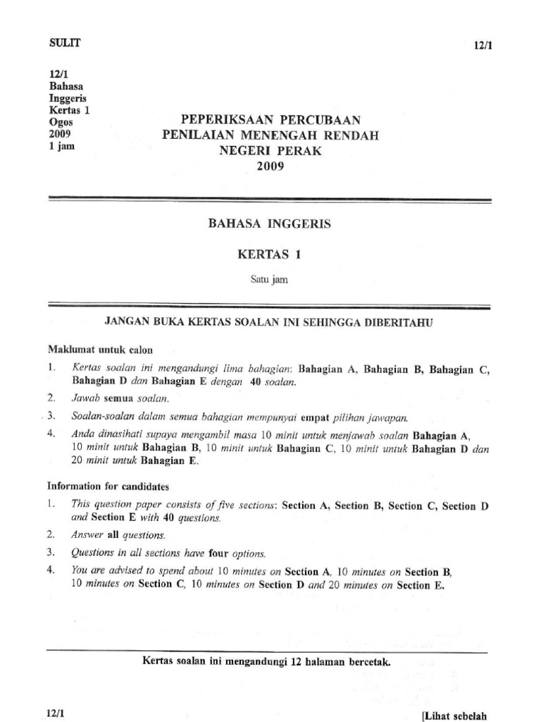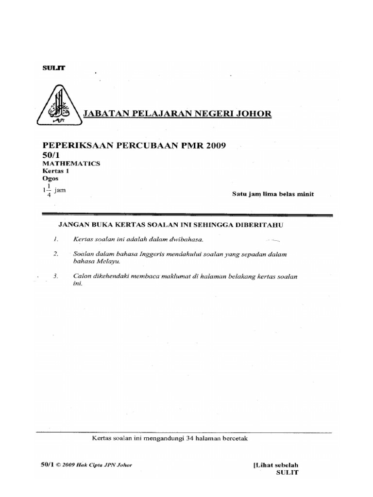 Peperiksaan Percubaan Pmr Tahun 2010 Peperiksaan Percubaan Pmr Tahun 2010 Bahasa Melayu Tingkatan 3 Kertas 1 Satu Jam Tiga Puluh Minit Jangan Buka Kertas Soalan Ini