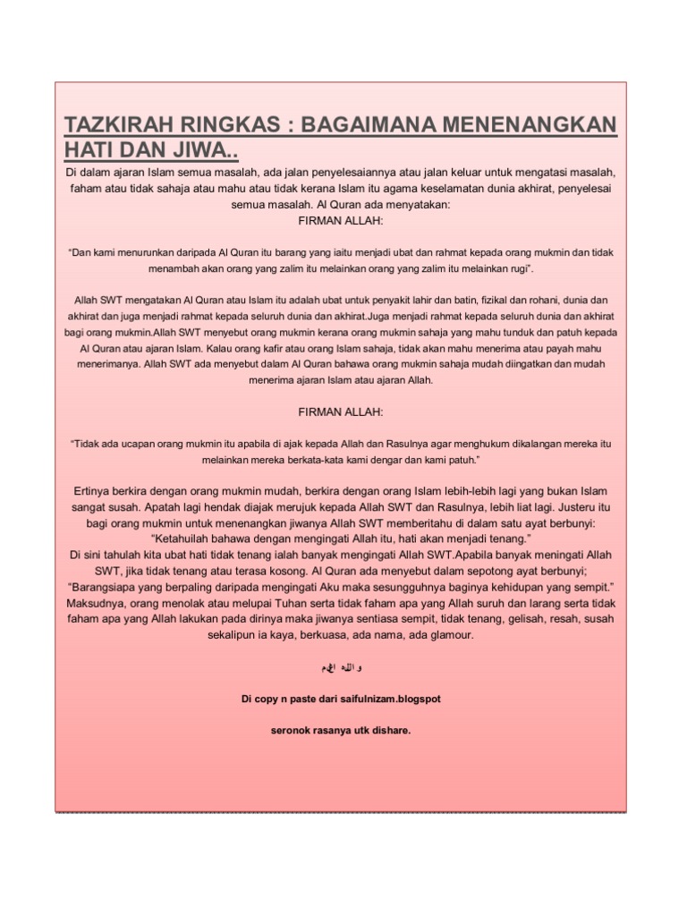 Tetapi matlamat blog tazkirah ini saya percaya sama dengan matlamat penulis asal. Semoga faedah dikongsi bersama. Perkara ini boleh terjadi kepada sesiapa sahaja baik hubungan antara ibu bapa dan anak hubungan antara adik beradik sahabat handai kawan sepejabat jiran tetangga dan masyarakat. Dan kalau rasa hati itu jahat maka jahatlah tindakan lahir manusia.